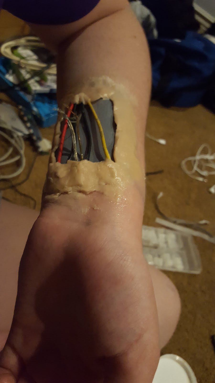 The effect I made this week took seven hours total to make (not including the one to two hours of research time): three to make the bones, and four for the actual application, only made possible by the fact that my model was willing to stay still for that long. To create a full zombie effect around this, it would likely take something closer to five or six hours, so as much as I'd like to have done that, it wasn't possible at present.